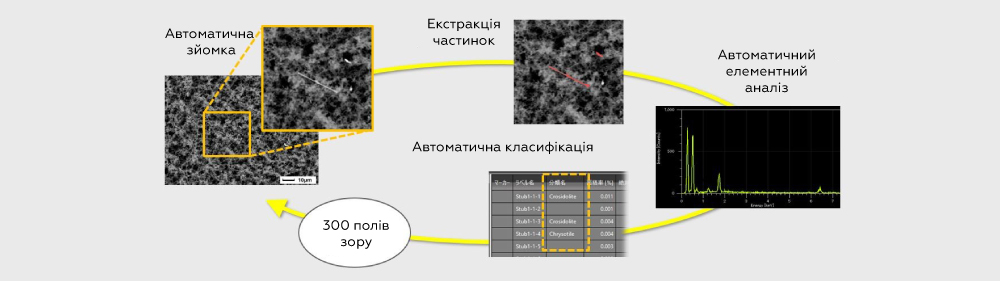 - Хімічна класифікація. EDS-система аналізує склад кожного волокна. Отримані дані порівнюються з попередньо налаштованою бібліотекою стандартів азбесту (хризотил, крокідоліт, амозит тощо).