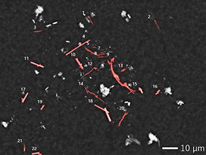 - Пошук частинок. Система сканує поле зору. Завдяки високому контрасту зображення BSE програма легко відокремлює волокна від підкладки фільтра.